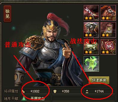 换装备后可以直观的看到普通攻击和战法攻击的变化。洗一套强壮lv6(就是两个lv3)的装备给徐晃,夏侯惇,前去征服那些拦路虎吧。
