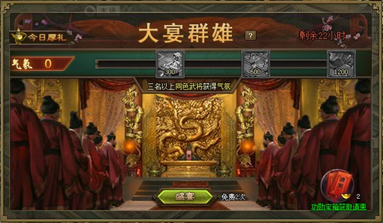 活动内容:活动期间,玩家通过送发请帖宴请群雄,可获得相应奖励。同时邀请到品质相同的三位武将时,可增加气氛值。当气氛值达到指定值时,可获得额外奖励。