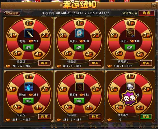 系统会在每日12点与24点各自刷新一次,每次刷新后产生6个道具。点击旋转后道具会进行打折,最低为1折。每次刷新后必定有一件道具免费。